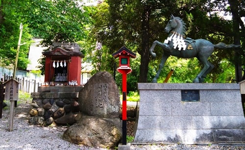 あっ!鳥居手前の右手には境内社と馬の像があります。